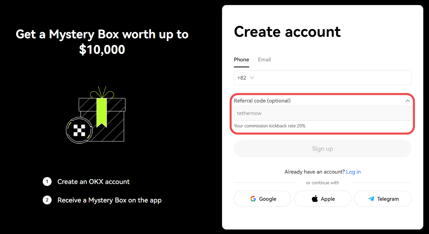 ② 가입창에서 레퍼럴 코드 "TETHERNOW" 가 맞는지 필히 확인해 주세요.